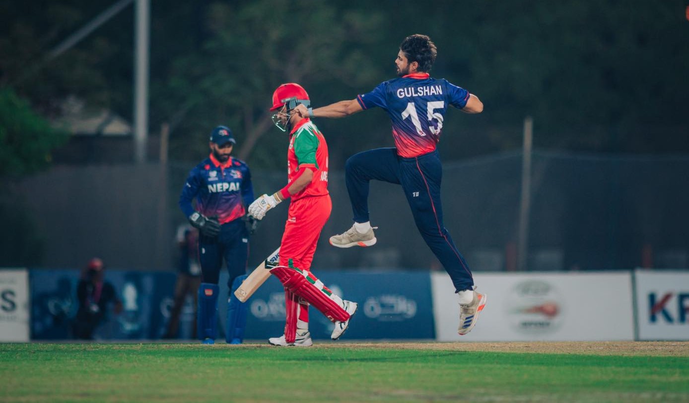१४औं ओभरमा गुल्सनले लगातार दुई विकेट लिँदै नेपाललाई सहज जितको बाटोमा दोहोर्याए । मोहम्मद नदीमलाई रोहितबाट क्याच गराएका गुल्सनले जितेनकुमार रमानन्दीलाई बोल्ड गरे । ओमानले १८औं ओभरको चौथो बलमा विनायकलाई गुमायो । सोमपालको बलमा उनी गुल्सनबाट क्याच भए । १९औं ओभरको पहिलो बलमा सुफ्यान मेहमूदलाई नन्दनले कुशल भुर्तेलबाट क्याच गराए ।