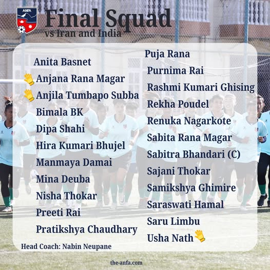 नेपालले यही कार्तिक ७ मा इरान र कार्तिक १० मा भारतसँग अन्तर्राष्ट्रिय मैत्रीपूर्ण खेल खेल्दैछ । भारतको शिलोङमा हुने यी दुई खेलका लागि तयार पारिएको राष्ट्रिय टोलीमा तीन पुराना अनुहार बहिरिएका छन् । फरवार्ड अनिता केसी, रक्षक अमृता जैशी र अट्याकिङ मिडफिल्डर विमला चौधरी टोलीमा अटाएनन् ।
