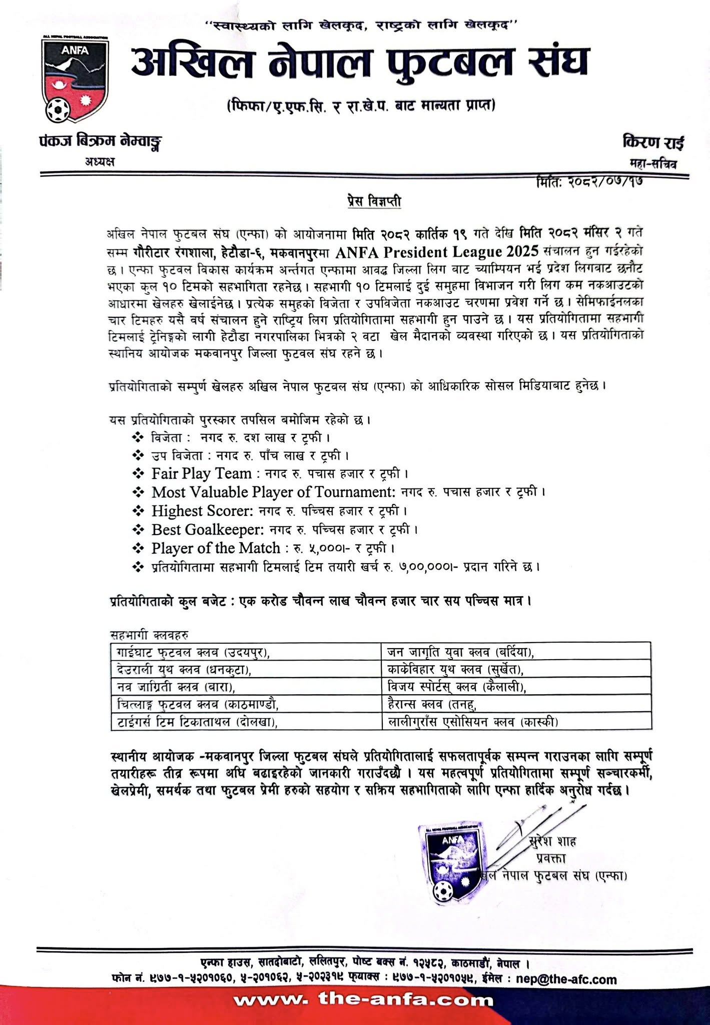 आइतबार अखिल नेपाल फुटबल संघ (एन्फा) ले प्रतियोगिताको सम्पूर्ण तयारी पूरा भएको जानकारी दिँदै पुरस्कार रकम सार्वजनिक गरेको हो ।