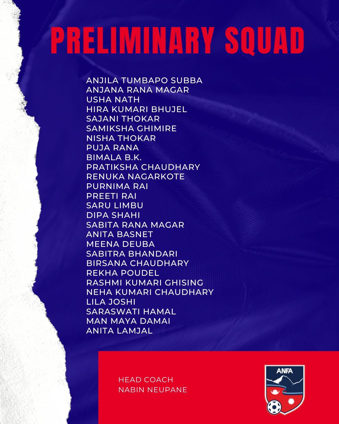 बुधबार मुख्य प्रशिक्षक नवीन न्यौपानेले भर्खरै भारतको सिलोङमा सम्पन्न त्रिदेशीय च्याम्पियनसिप खेलेको टोलीमा चार खेलाडी थप्दै प्रारम्भिक टोली तयार पारेका हुन् । नेपालले यही नोभेम्बर अन्तिम साता अर्को त्रिदेशीय च्याम्पियनसिपका लागि इन्डोनेसिया भ्रमण गर्र्दैछ । त्यसैको तयारीस्वरुप २७ सदस्यीय प्रारम्भिक टोली घोषणा भएको हो ।