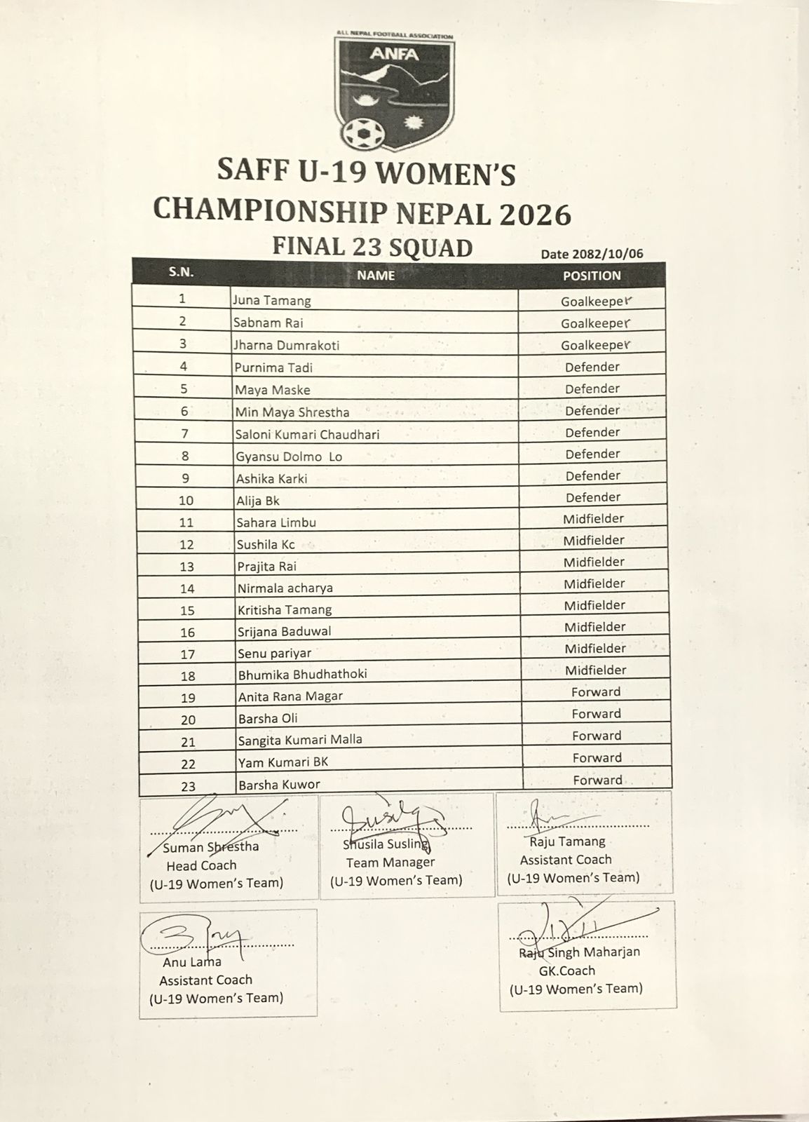 मंगलबार सुमन श्रेष्ठको नेतृत्वमा रहेको प्रशिक्षण टिमले १७ दिनको छनोटपछि २३ सदस्यीय अन्तिम टोली घोषणा गरेका हुन् ।