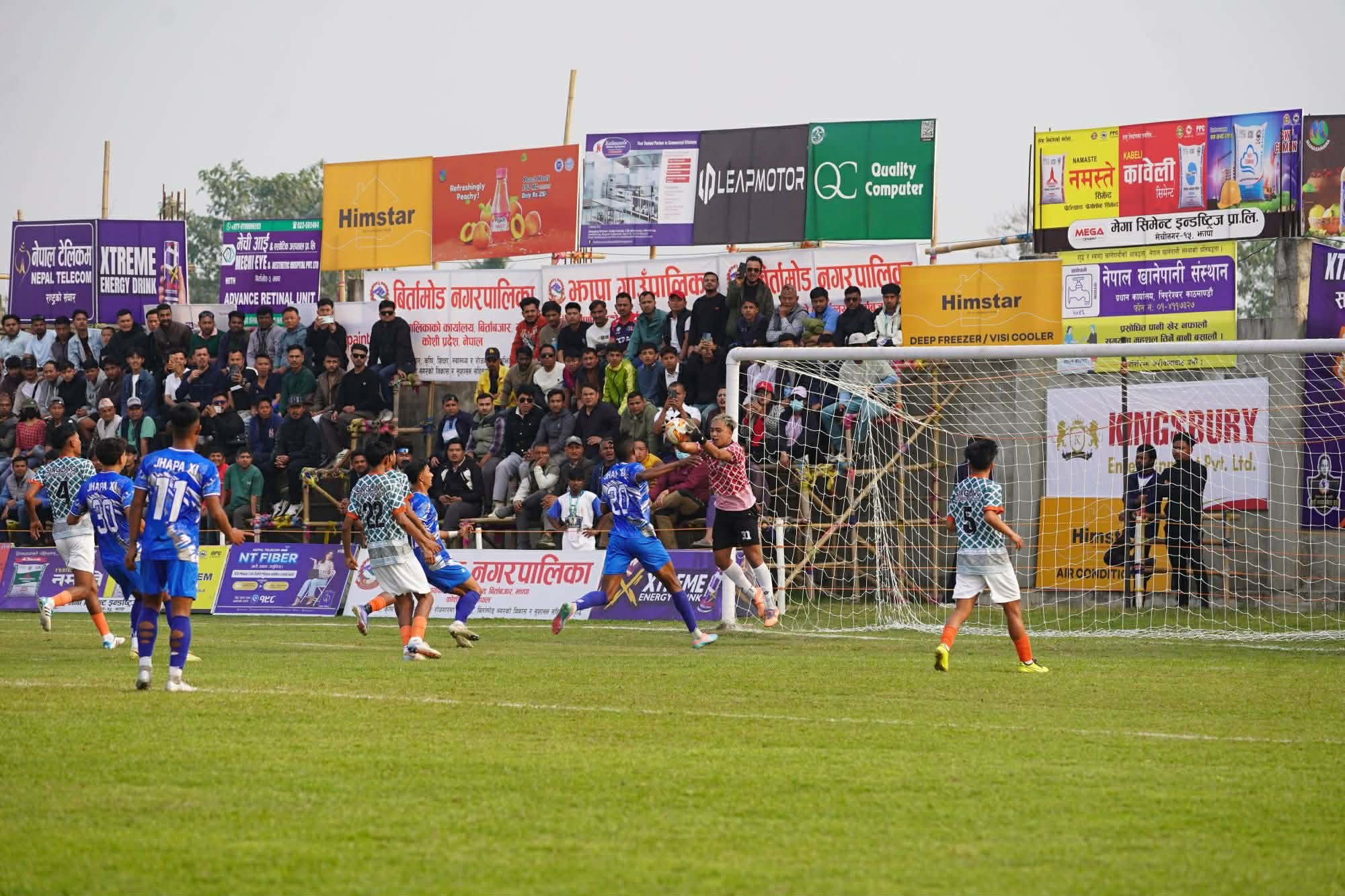 बिर्तामोड । आयोजकको टिम झापा-११ फुटबल क्लब कठिन जित निकाल्दै झापाको बिर्तामोडमा जारी सातौँ एक्स्ट्रिम झापा गोल्डकपको सेमिफाइनलमा प्रवेश गरेको छ । पहिलो क्वार्टर फाइनलमा सिक्किमको सिङलिङ स्पोेर्टिङ क्लबलाई टाइब्रेकरमा ४-३ ले पराजित गर्दै झापाले सेमिफाइनलमा स्थान सुरक्षित गरेको हो ।