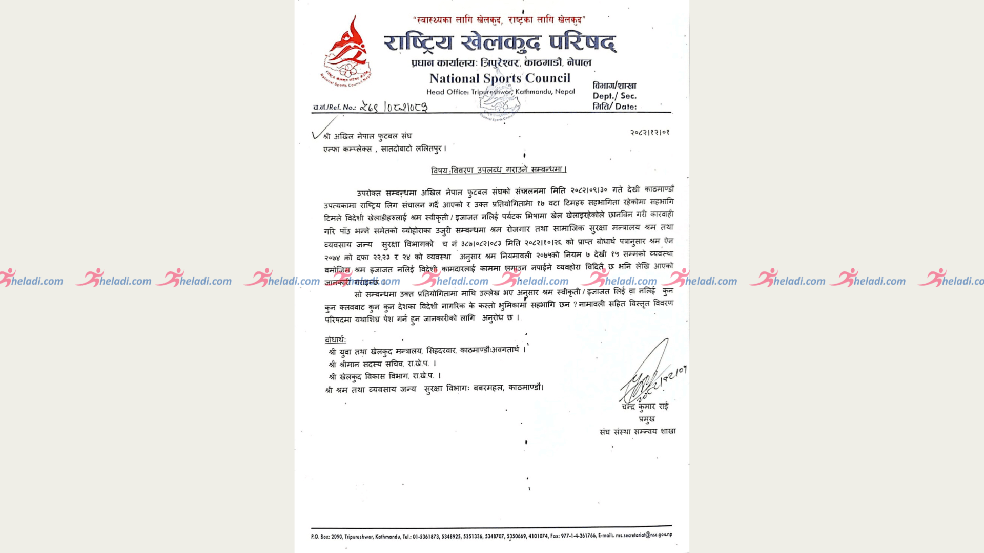 ‘एन्फाले २०८२–०८–३० गते देखि काठमाडौं उपत्यकामा राष्ट्रिय लिग सञ्चालन गर्दै आएको र उक्त प्रतियोगितामा १७ वटा टिमहरु सहभागिता रहेकोमा सहभागी टिमले विदेशी खेलाडीलाई श्रम स्वीकृति/इजाजत नलिइ पर्यटक भिसामा खेल खेलाइरहेकोले छानविन गरि कारबाही गरिपाउँ भन्ने समेतको ब्यहोराका उजुरी सम्बन्धमा श्रम रोजजार तथा सामाजिक सुरक्षा मन्त्रालय श्रम तथा व्यावसाय जन्य सुरक्षा विभागको प्राप्त बोधार्थ पत्रानुसार श्रम ऐन २०७४ को व्यवस्थाअनुसार श्रम नियमावली २०७५ को व्यवस्थाबमोजिम श्रम इजाजत नलिइ विदेशी कामदारलाई काममा लगाउन नपाइने ब्यहोरा विदितै छ भनि लेखिआएको जानकारी गराइन्छ,’ राखेप संघ संस्था समन्वय शाखाका प्रमूख चन्द्रकुमार राईद्धारा प्रेसित पत्रमा उल्लेख छ, ‘सो सम्बन्धमा उक्त प्रतियोगितामा माथि उल्लेख भएअनुसार श्रम स्वीकृति/इजाजत लिइ वा नलिइ कुन कुन क्लबबाट कुन कुन देशका विदेशी नागरिक के कस्तो भूमिकामा सहभागी छन् ? नामावलीसहित विस्तृत विवरण परिषदमा यथासिघ्र पेश गर्न हुन जानकारीको लागि अनुरोध छ ।’